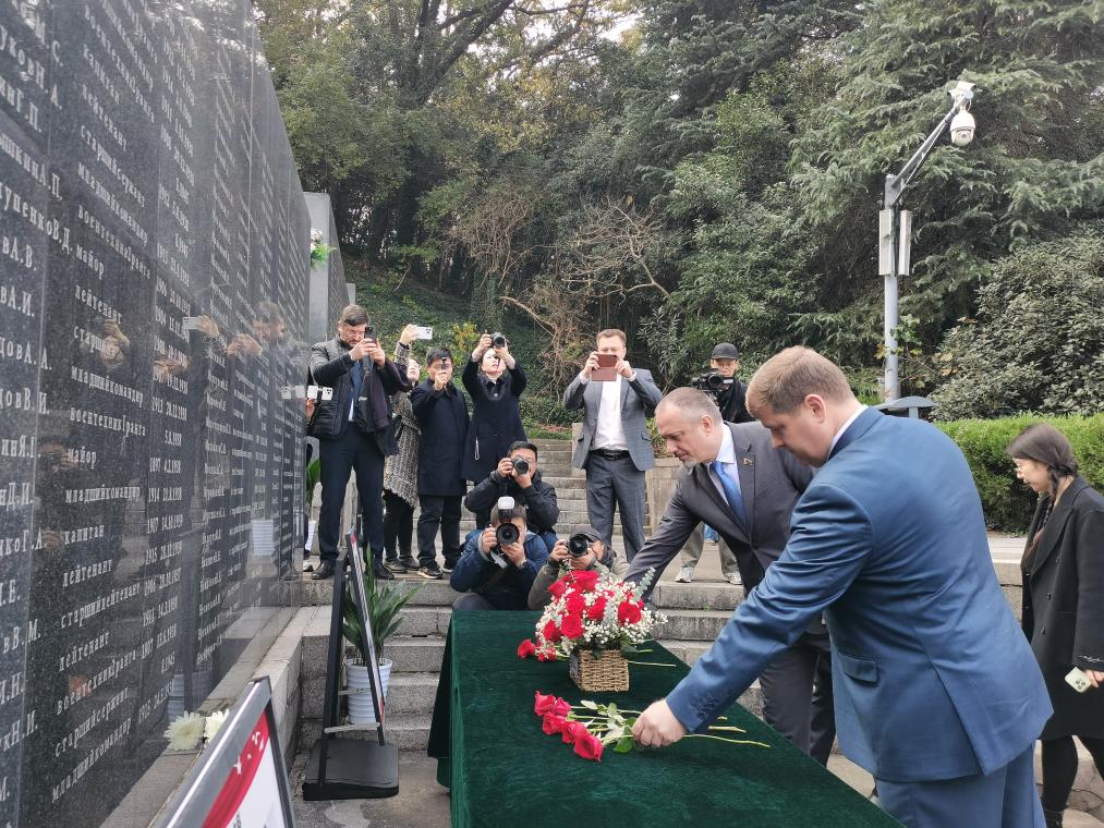 11月22日,在江苏省南京市的南京抗日航空烈士纪念馆,白俄罗斯驻沪总领事安德烈夫(右二)、俄罗斯驻沪副总领事日日金(右一)在苏联英烈碑前献花。新华社记者 蒋文茜 摄