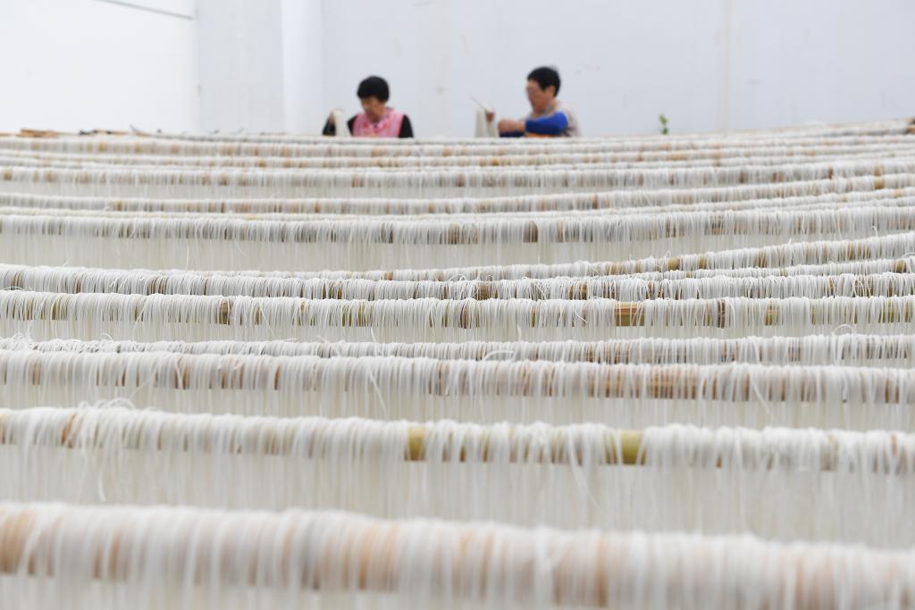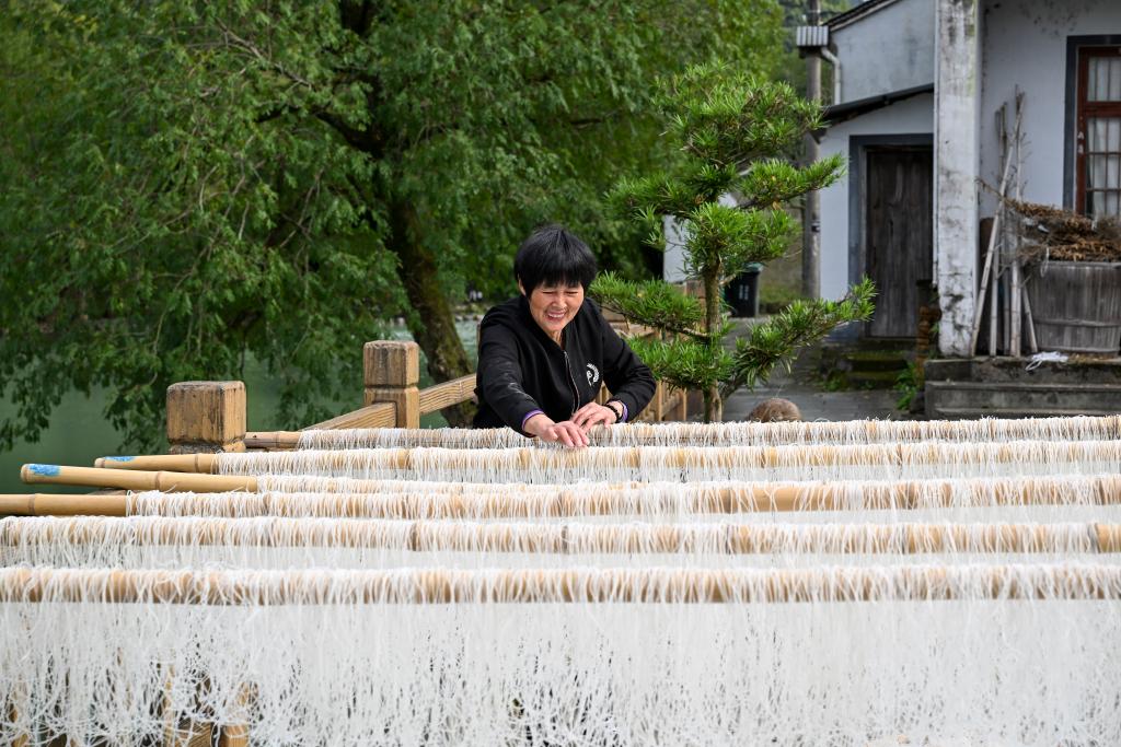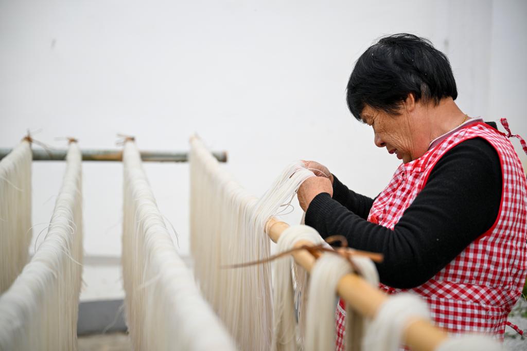11月20日,在浙江余姚鹿亭乡中村的共富工坊,村民晾晒刚刚制成的番薯粉丝。