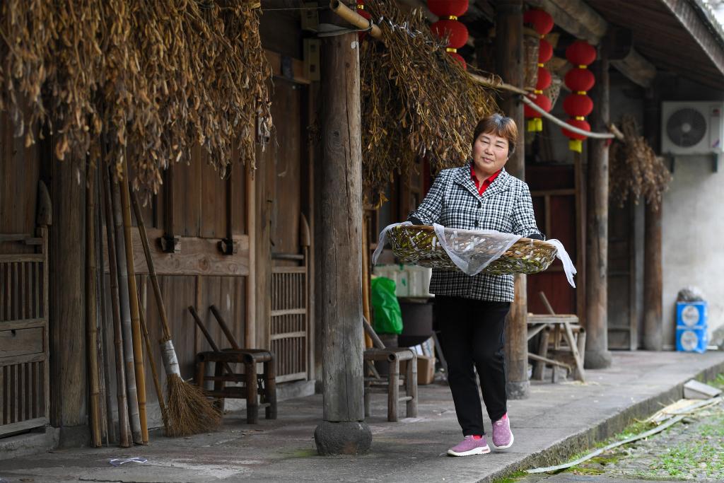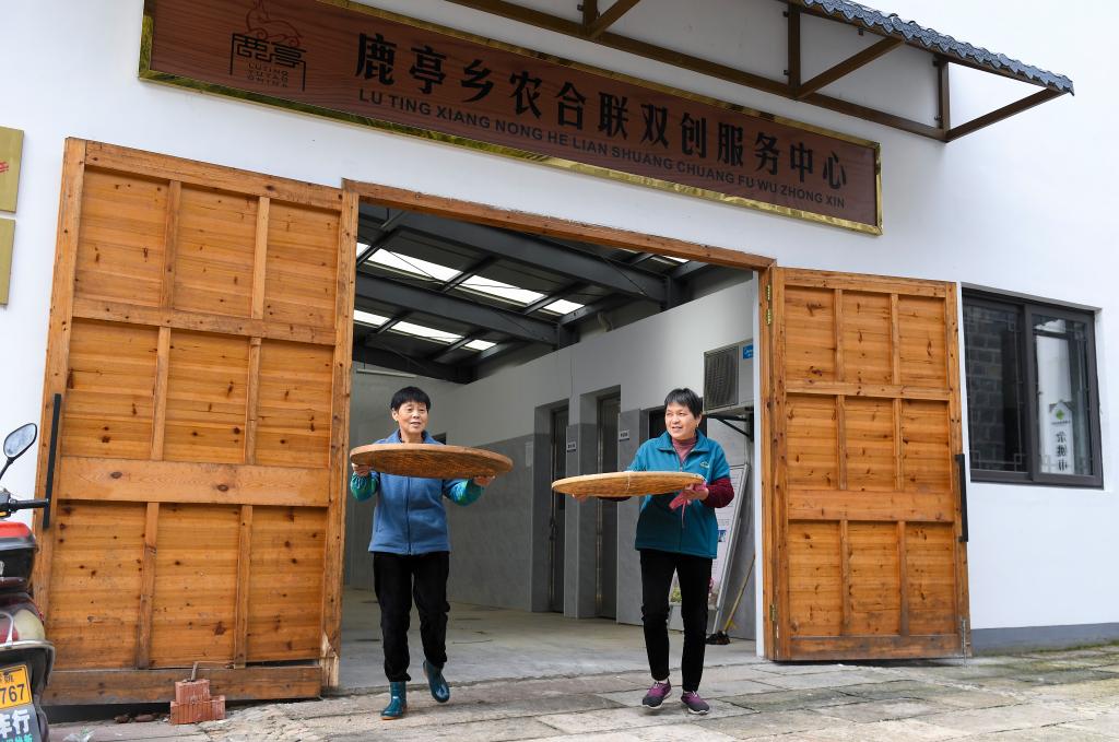 11月20日,在浙江余姚鹿亭乡“鹿亭农合”共富工坊,村民在晾晒番薯粉丝。