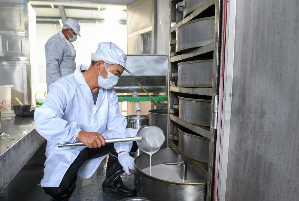 11月20日,在浙江余姚鹿亭乡中村的共富工坊,村民将番薯浆倒入蒸屉。