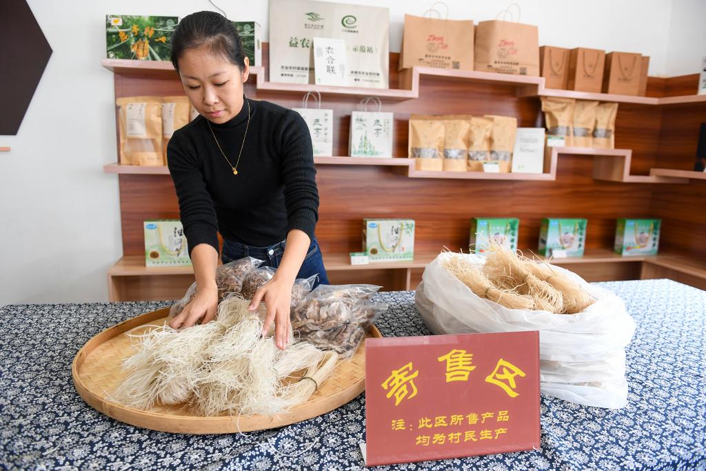 11月20日,在浙江余姚鹿亭乡的农合联中村服务社,工作人员整理村民寄售的粉丝和笋干等产品。