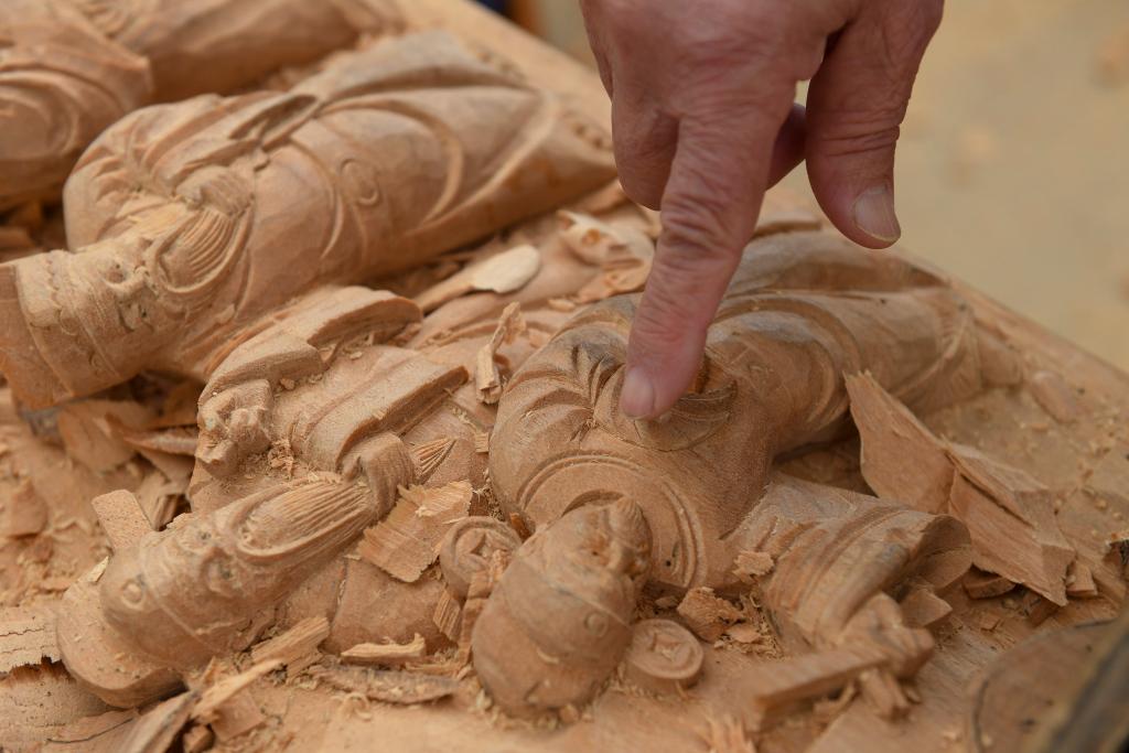 11月22日,在浙江临海汇溪镇浚头村,黄大树指导当地工匠雕刻梁上的故事画。