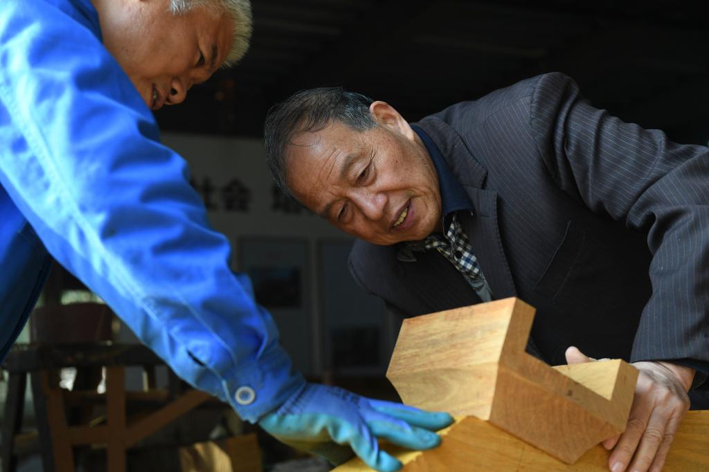 11月22日,在浙江临海汇溪镇浚头村,黄大树(左)与木雕师傅探讨花纹样式。
