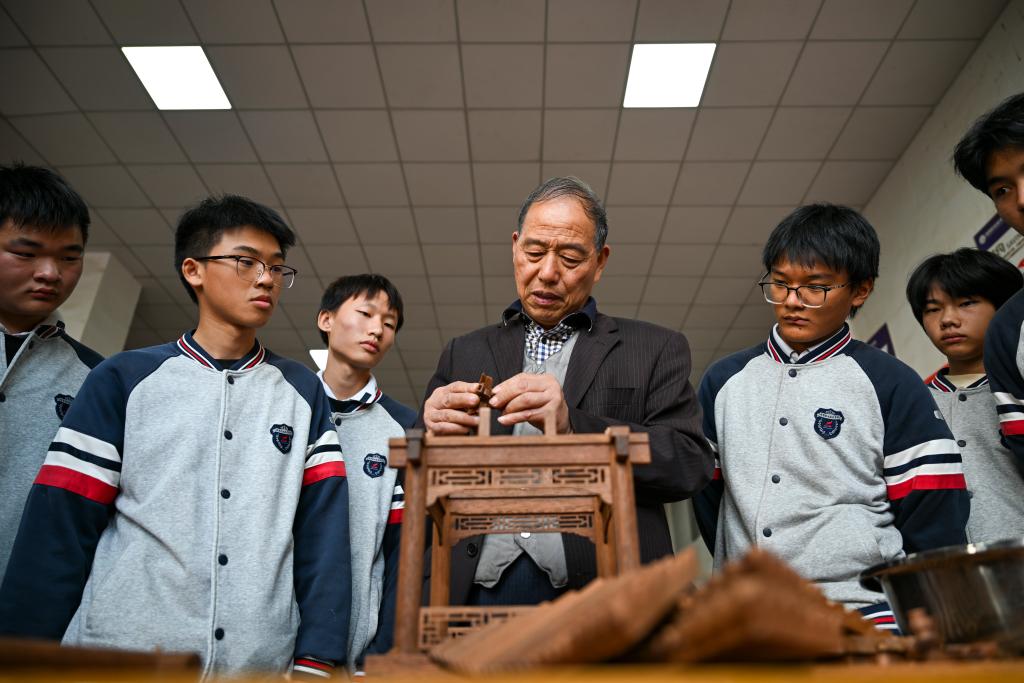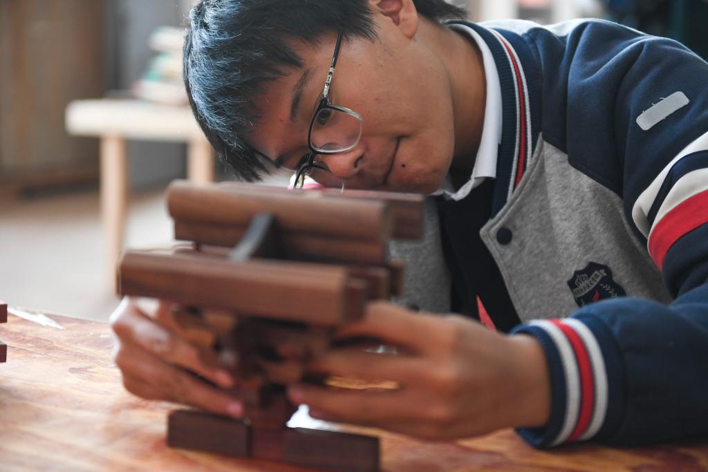 11月22日,在临海市海商职业技术学校,学生在资深工匠的指导下学习制作鲁班锁。