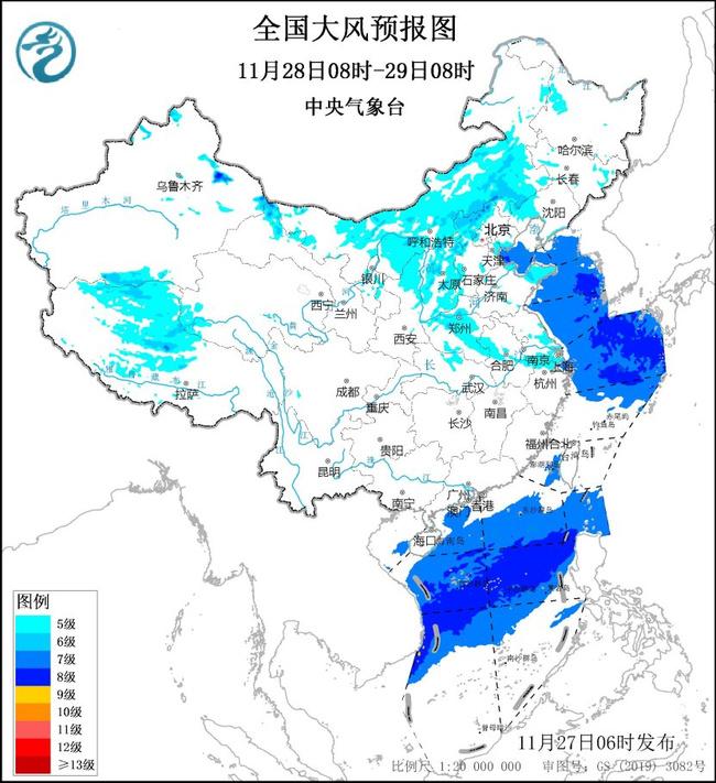 预计,11月27日08时至28日08时,内蒙古大部、宁夏、陕西北部、山西、河北、北京、天津、河南大部、辽宁西部、山东、上海、江苏、浙江北部等地部分地区有4~5级、阵风6~8级的大风,部分地区风力可达7级;渤海、渤海海峡、黄海大部海域、东海北部海域将有7~8级、阵风9~10级的西北风,台湾海峡、台湾东南洋面、巴士海峡、南海北部和中部海域、北部湾将有7~8级、阵风9级的偏东到东北风。