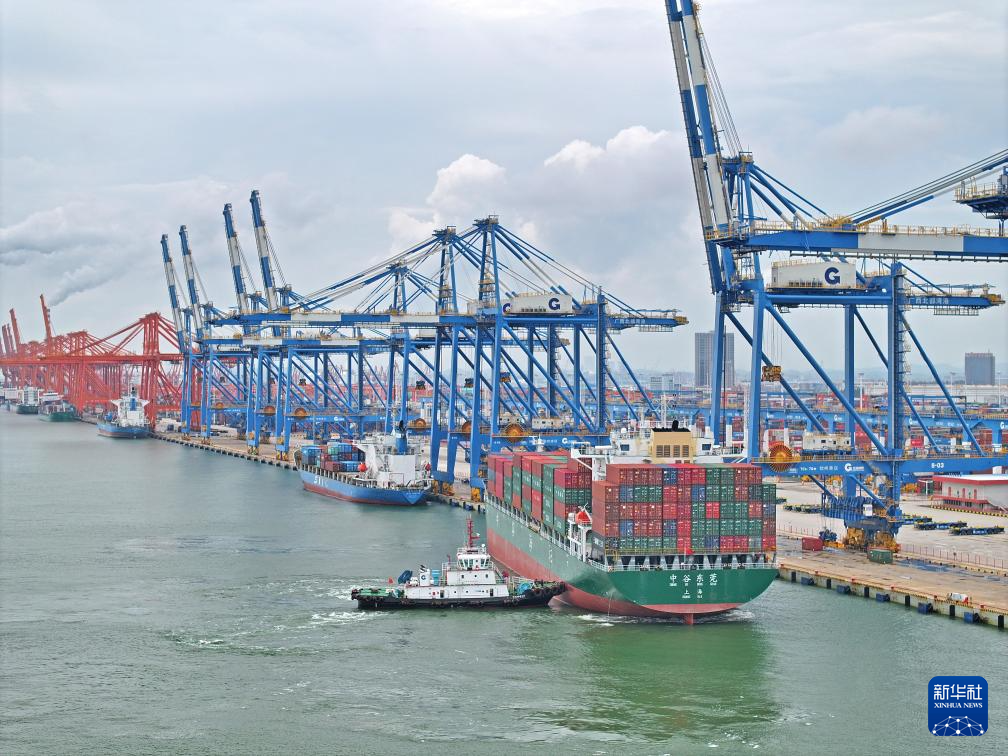 货轮在广西北部湾港钦州港区自动化码头靠泊(2024年8月15日摄,无人机照片)。新华社记者 周华 摄