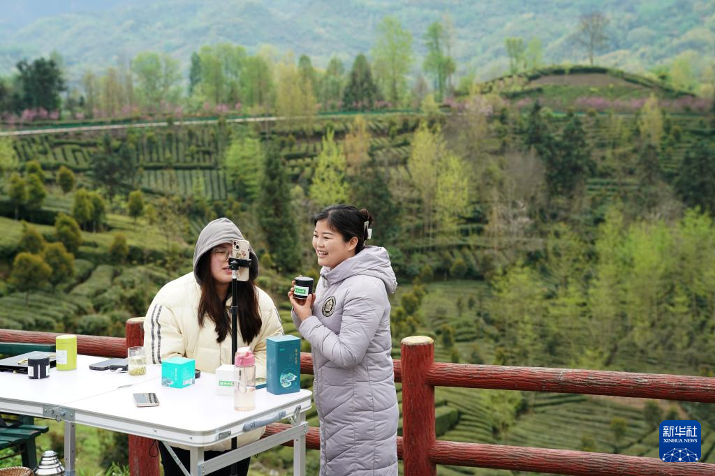 电商主播在陕西省汉中市西乡县峡口镇茶园内直播带货销售茶叶(2023年4月4日摄)。新华社记者 邵瑞 摄