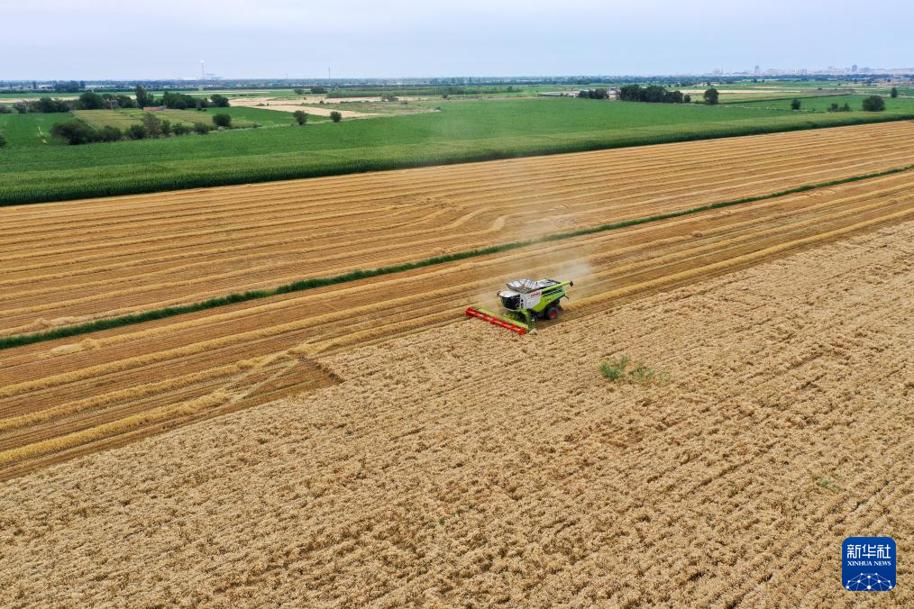 在新疆昌吉回族自治州奇台县西北湾镇,农户在田间收获小麦(2024年7月9日摄,无人机照片)。新华社记者 丁磊 摄