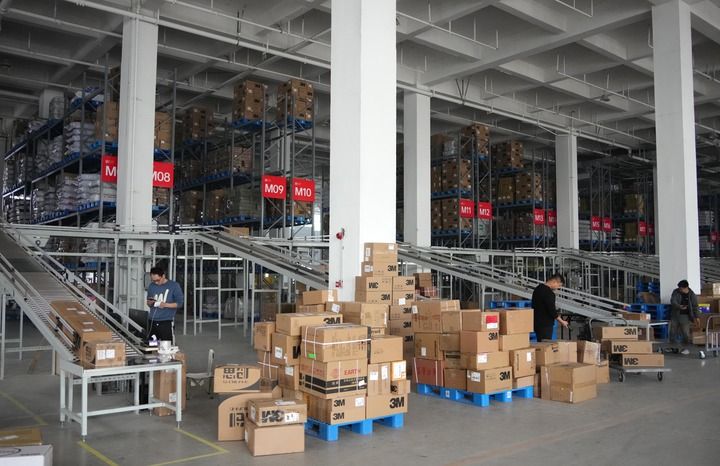 在临沂商城的物流仓储区,工作人员在配送货物(2024年10月30日摄)。新华社记者 徐速绘 摄