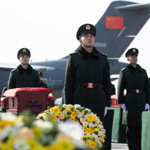 11月28日,在沈阳桃仙国际机场,礼兵将殓放志愿军烈士遗骸的棺椁从专机上护送至棺椁摆放区。新华社发(韩启扬 摄)