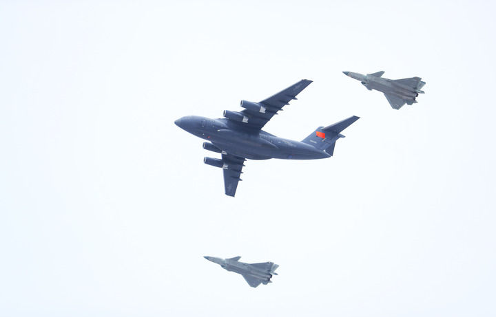 2024年11月28日,接运第十一批在韩中国人民志愿军烈士遗骸回国的空军运-20专机在空军两架歼-20战机的伴飞护航下,抵达沈阳桃仙国际机场上空。新华社记者 李钢 摄