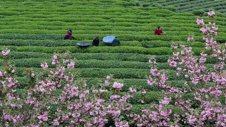 2024年4月6日,村民在贵州省遵义市凤冈县永安镇田坝社区茶叶基地采摘春茶(无人机照片)。新华社发(王超 摄)