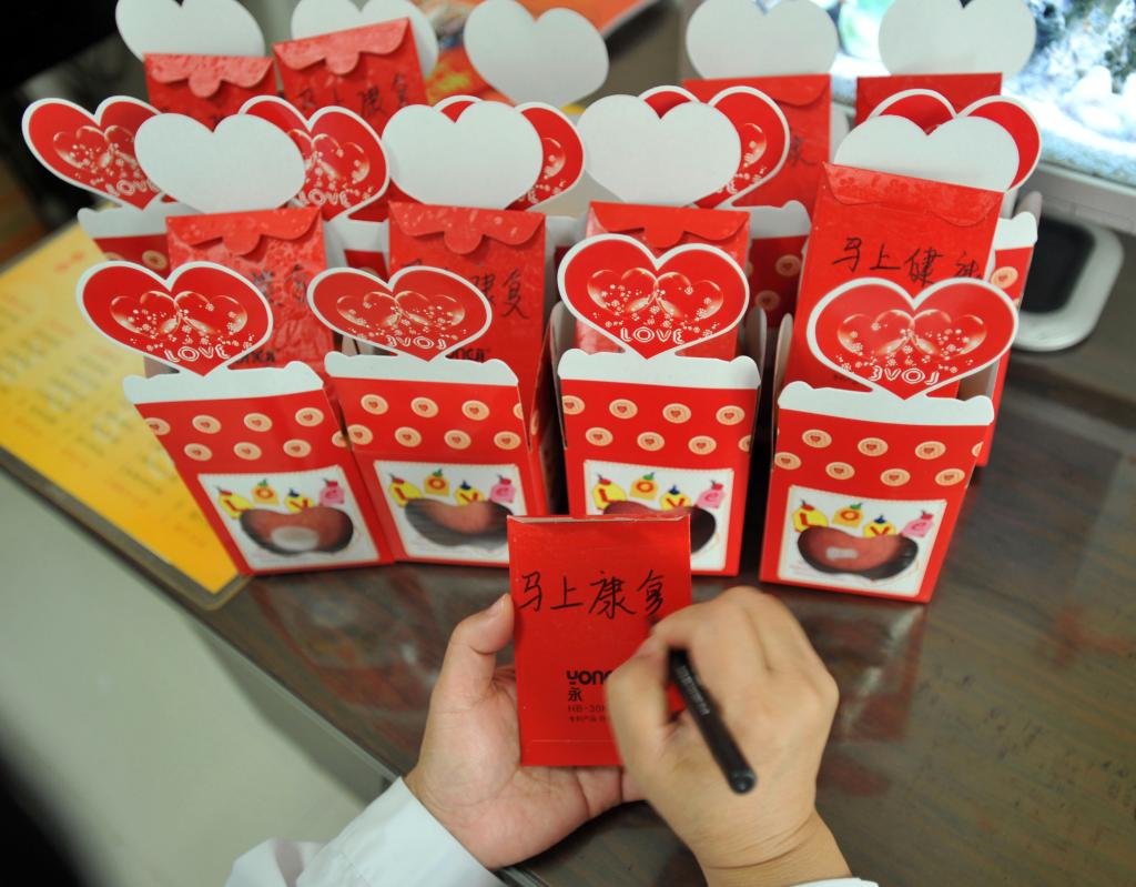 在广西南宁市第四人民医院艾滋病科,护士长杜丽群为住院病人准备新年祝福“小礼包”(2014年1月30日摄)。