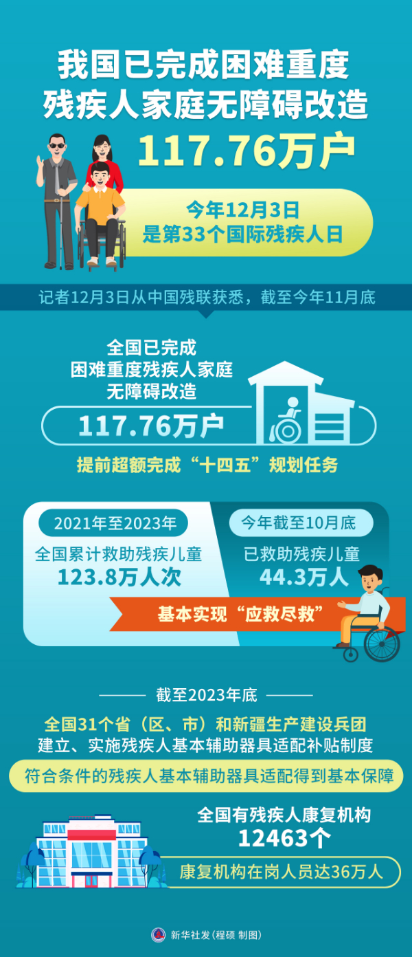 新华社北京12月3日电(记者范思翔)今年12月3日是第33个国际残疾人日。记者3日从中国残联获悉,截至今年11月底,全国已完成困难重度残疾人家庭无障碍改造117.76万户,提前超额完成“十四五”规划任务。
