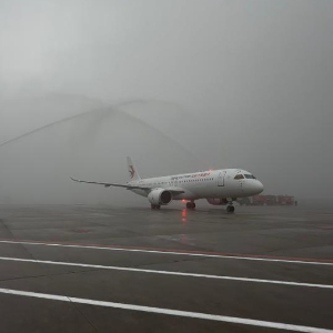 国产大飞机C919在重庆江北国际机场通过水门。新华社记者 赵佳乐 摄