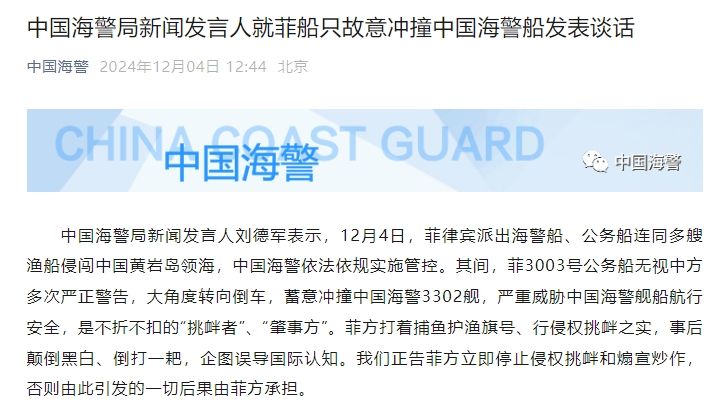 中国海警局新闻发言人刘德军表示,12月4日,菲律宾派出海警船、公务船连同多艘渔船侵闯中国黄岩岛领海,中国海警依法依规实施管控。其间,菲3003号公务船无视中方多次严正警告,大角度转向倒车,蓄意冲撞中国海警3302舰,严重威胁中国海警舰船航行安全,是不折不扣的“挑衅者”、“肇事方”。菲方打着捕鱼护渔旗号、行侵权挑衅之实,事后颠倒黑白、倒打一耙,企图误导国际认知。我们正告菲方立即停止侵权挑衅和煽宣炒作,否则由此引发的一切后果由菲方承担。