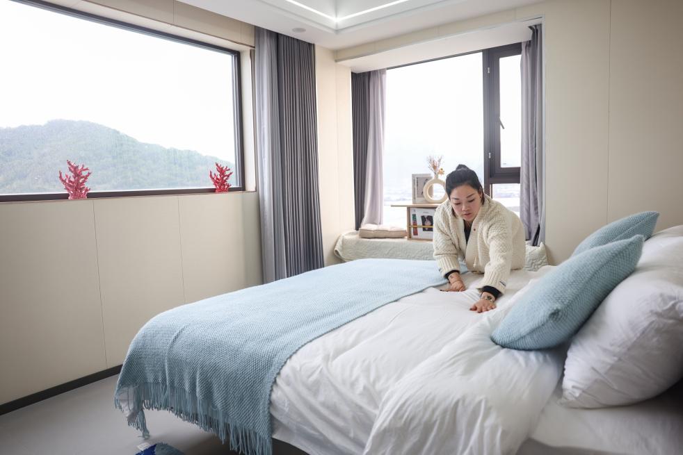 12月4日,福州市连江县奇达村民宿经营者李南南在整理民宿客房。