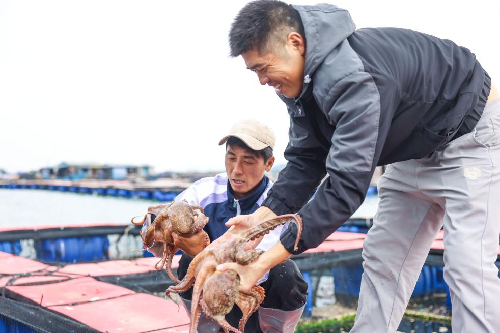 12月4日,福州市连江县奇达村养殖户王金乐(左)与村干部陈波一起检查养殖的章鱼。