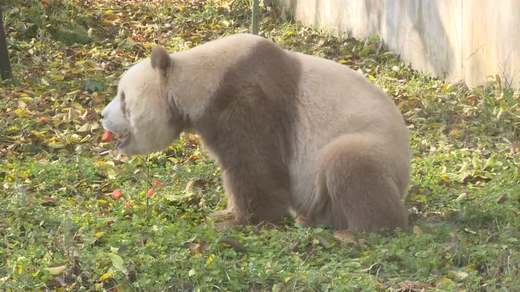 近日,在位于陕西省西安市的秦岭大熊猫研究中心,记者拍到全球唯一一只圈养的棕色大熊猫七仔正在享受美食胡萝卜,快来一起欣赏吧。