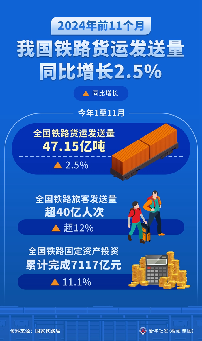新华社北京12月11日电(记者叶昊鸣)记者11日从国家铁路局获悉,今年1至11月,全国铁路货运发送量47.15亿吨,同比增长2.5%。