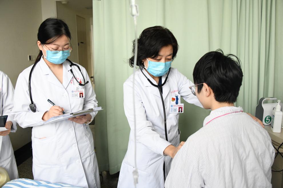 图为河北大学附属医院呼吸与危重症医学科主任李峥(右二)为患者诊疗。新华社发