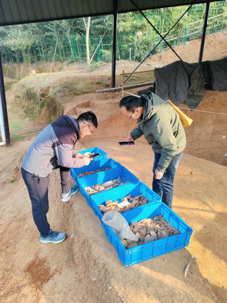 12月12日上午,考古学者在观察遗址出土的陶片。新华社记者冯源 摄