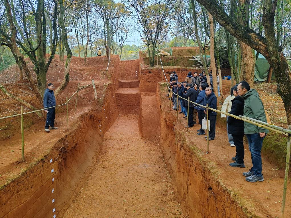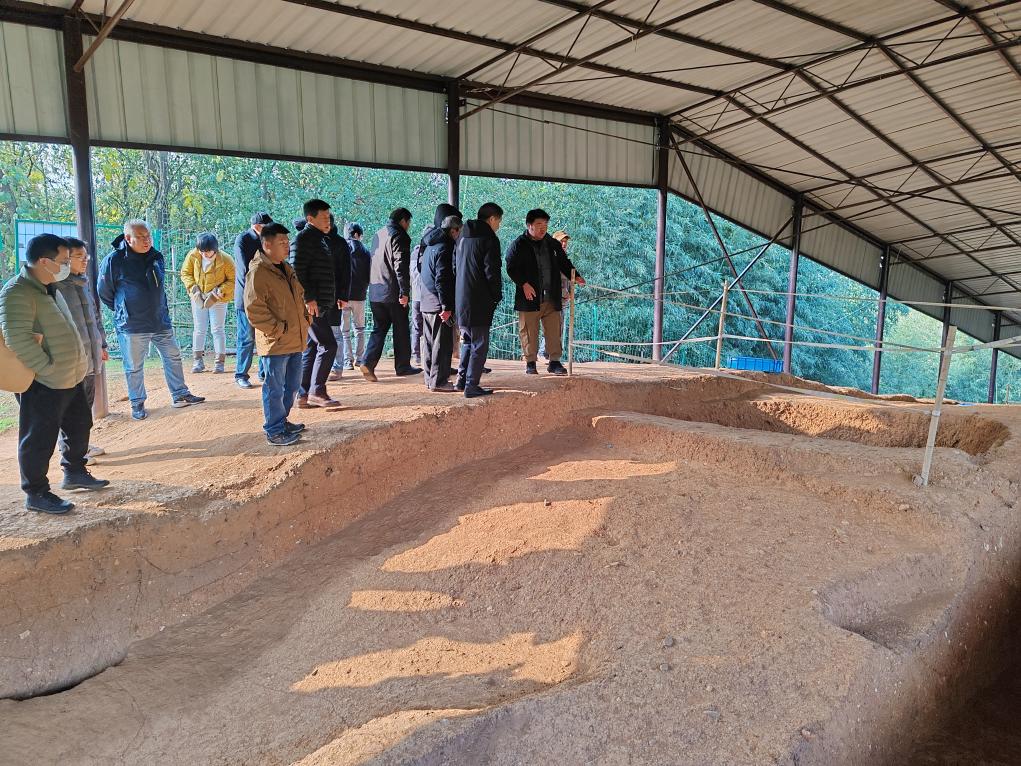 12月12日上午,全国多地的考古专家考察石角山古城遗址现场。新华社记者冯源 摄