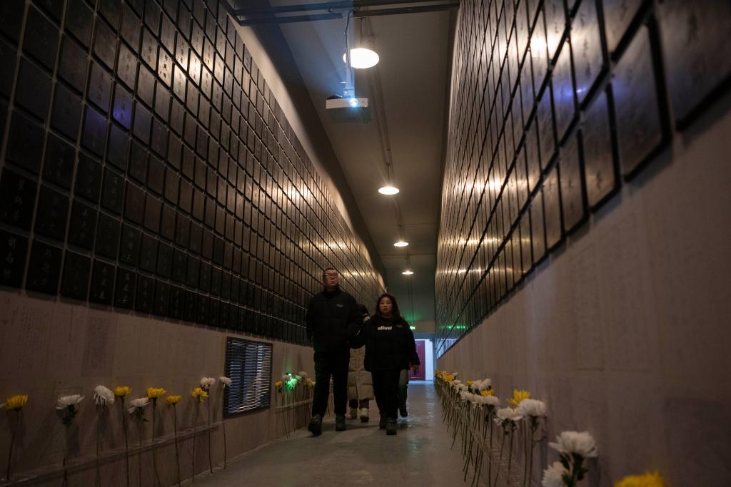 在731部队本部旧址中心走廊一楼,3000块长方形黑色石碑整齐陈列于墙体两侧,形成一条庄严肃穆的长廊。往来工作人员、参观者、志愿者纷纷献上菊花、沉思缅怀。