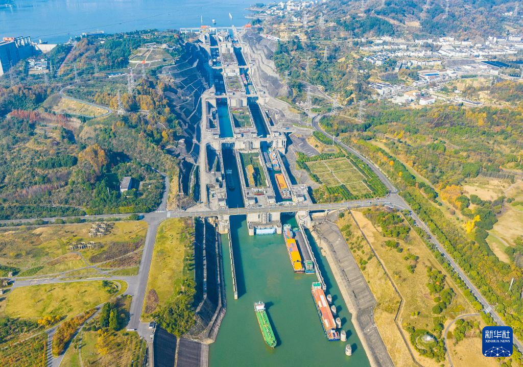 12月14日,船舶有序通过三峡双线五级船闸(无人机照片)。新华社发(郑家裕摄)