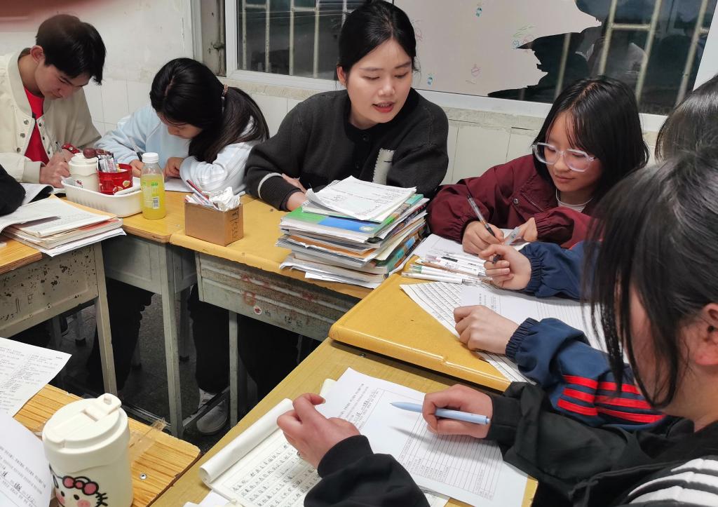 2024年4月21日,云南昭通大关一中教师刘雪瑶(左三)在辅导学生做作业。(李龙强 摄)