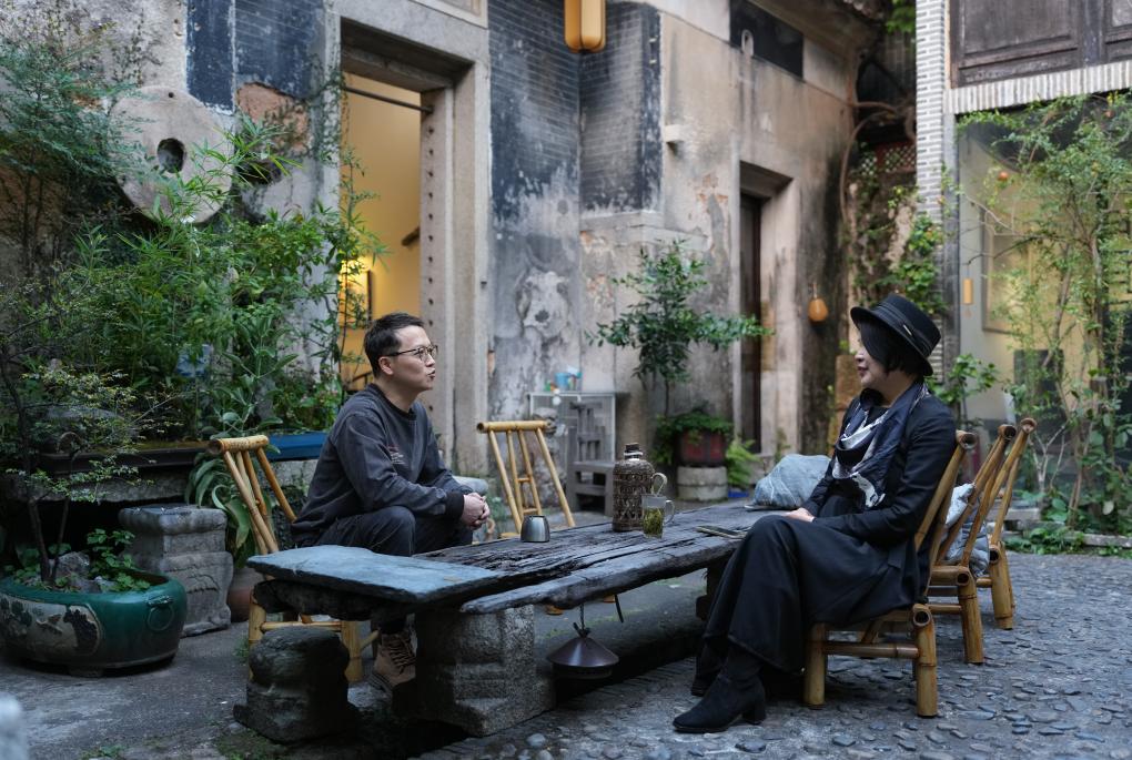 12月13日,在深圳市龙岗区大芬油画村太阳山艺术中心,陈剑华(左)与同行交流。
