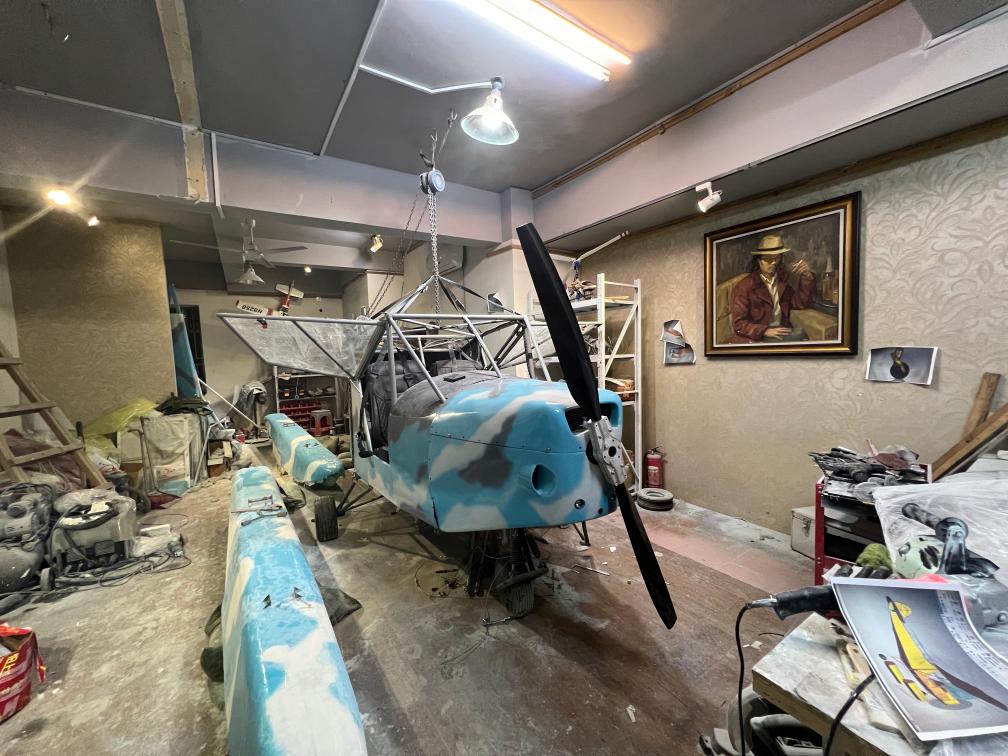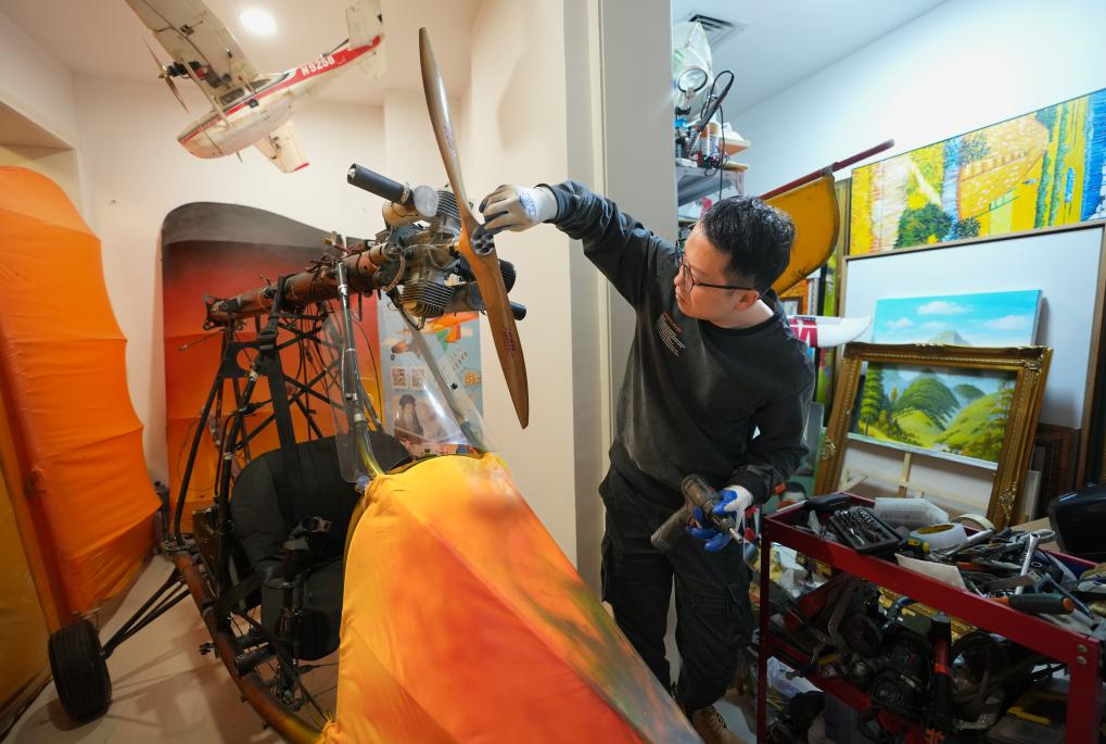 在大芬村的工作室,他搭建起工作间,开始了造飞机之旅。从学习CAD制图到寻找合适材料搭建飞机骨架,从发动机调试到亲手设计飞机外观,他常常在工作间里一待就是十几个小时。2021年5月,他的第一架飞机“艺翔号”诞生。“艺和翔代表着我在画笔与机翼间的逐梦人生。”陈剑华说。