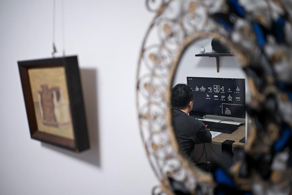 12月13日,在位于深圳市龙岗区大芬油画村的工作室,陈剑华在电脑上绘制飞机图纸。