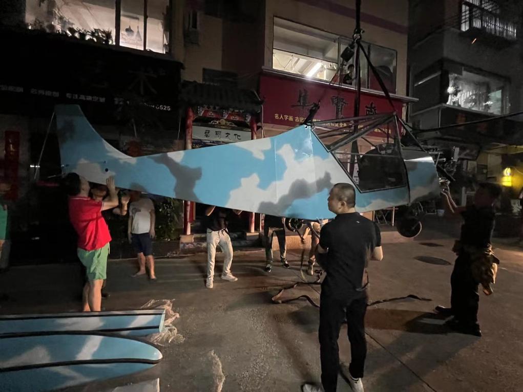 陈剑华制造的飞机完工并吊装下楼,准备送至大芬美术馆广场展示(资料照片)。新华社发(受访者供图)