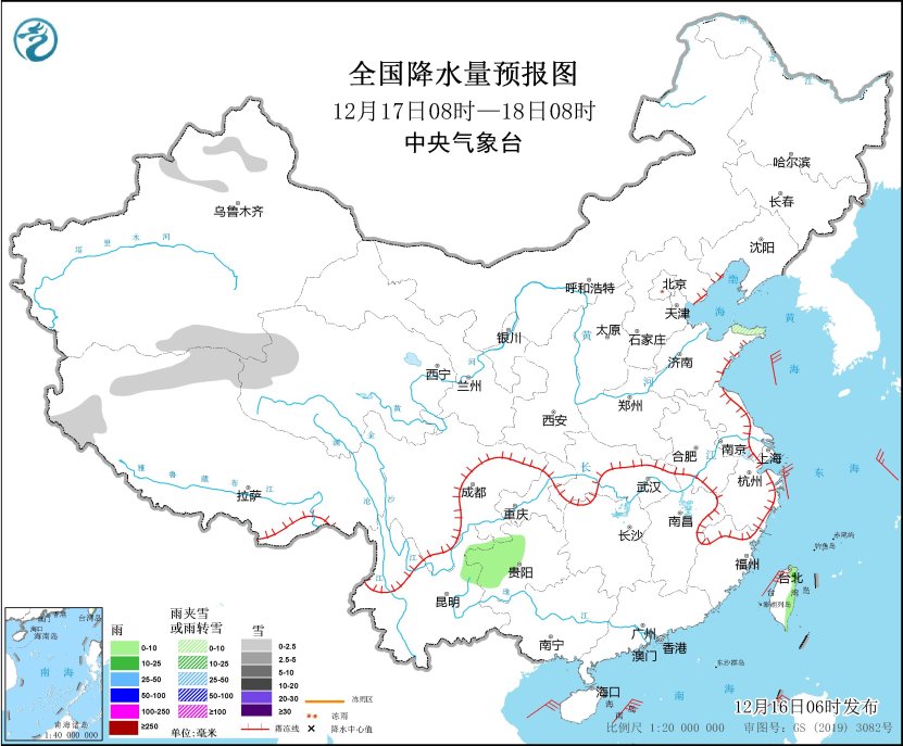全国降水量预报图(12月16日08时-17日08时)。图片来源:中央气象台网站