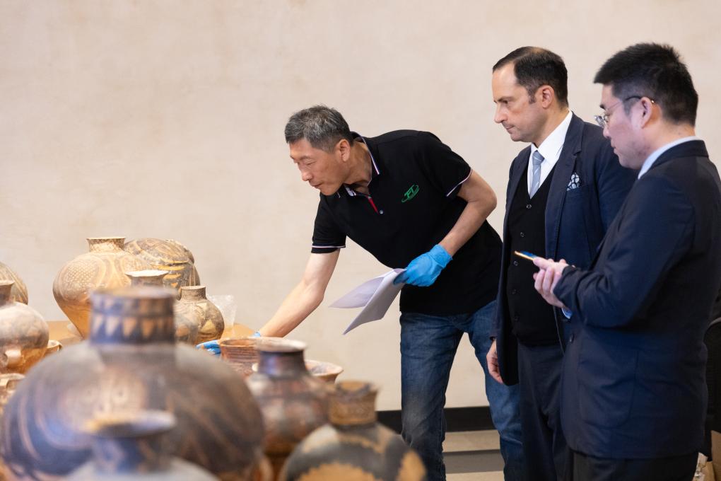 56件流失文物艺术品从意大利回归祖国怀抱。10月28日,在意大利罗马,中意双方工作人员在文物装箱前检查核对。新华社记者 李京 摄