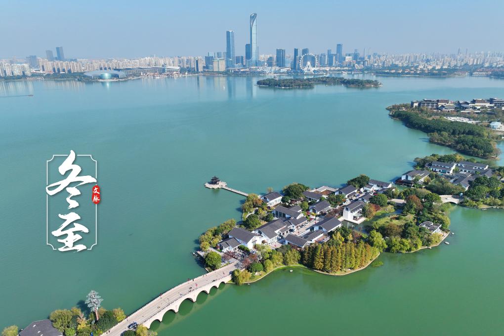 江苏省苏州工业园区金鸡湖中李公堤冬景如画。(无人机照片)CICPHOTO/王建中 摄