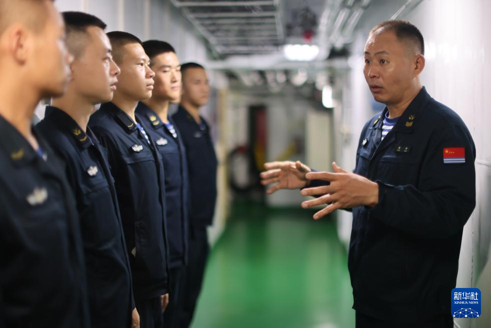 海军导弹驱逐舰海口舰技师周帅(右)出海期间向班成员部署基础训练任务(2024年6月25日摄)。新华社发(杨云翔 摄)