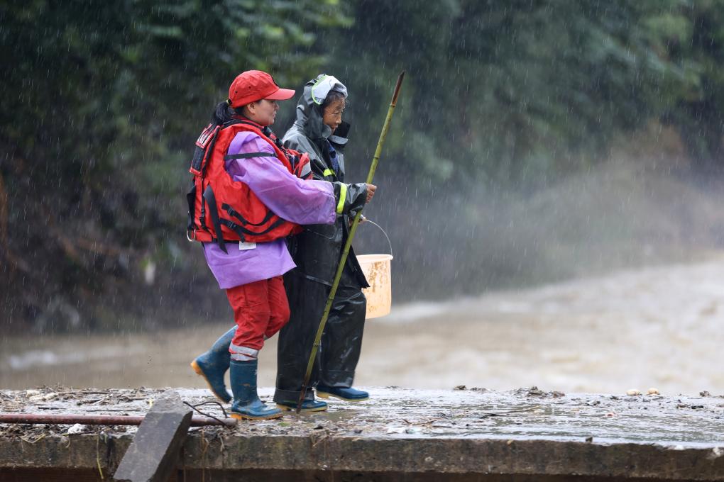 6月26日,山越救援队队员程红梅(左)在安徽省黄山市歙县绍濂乡和平村帮助村民过桥。