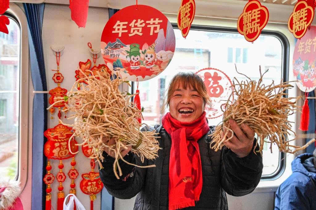 2月5日,在遵义开往重庆西的5630次列车上,旅客在车上展示选购的农产品。