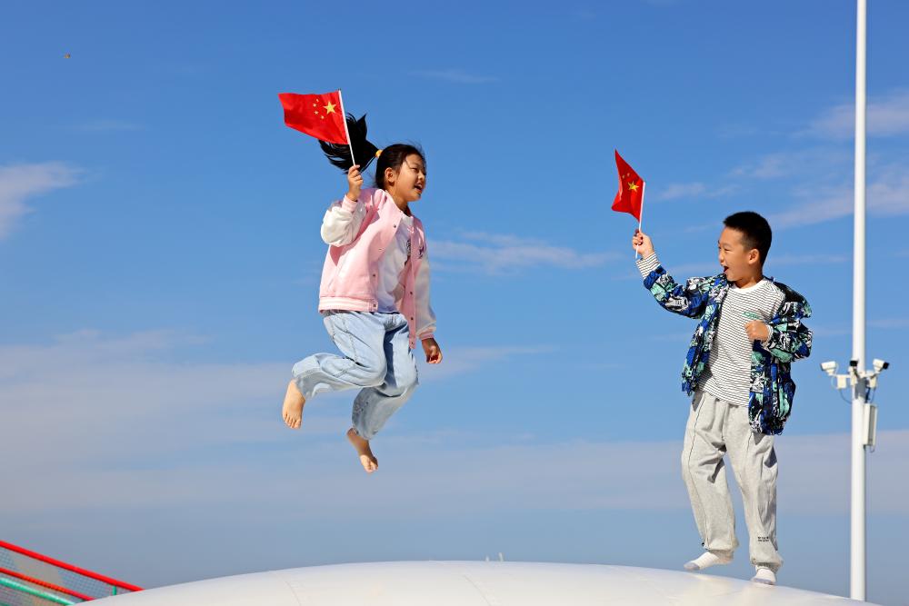 10月1日,在山东省枣庄市东湖公园,小朋友在“弹力球”上跳跃。