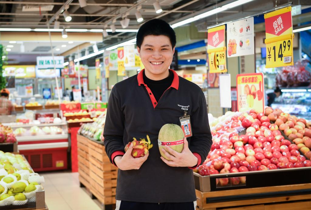 这是3月22日在广东省深圳华润万家超市翠竹店拍摄的“心青年”冉钰龙。冉钰龙是这里的员工,主要负责整理生鲜果蔬区的货品和检查产品保质期。“心青年”是指心智障碍青年,包括孤独症青年、唐氏青年、脑瘫青年等。近年来,随着社会更多的包容和理解,许多“心青年”有机会走上工作岗位,尝试力所能及的工作。