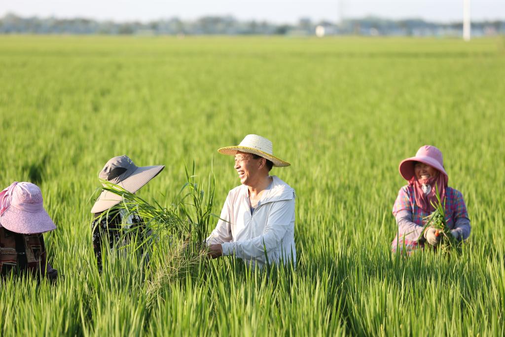 8月31日,在江苏省淮安市洪泽区岔河镇,农民企业家赵建国(右二)与村民在水稻田除草。