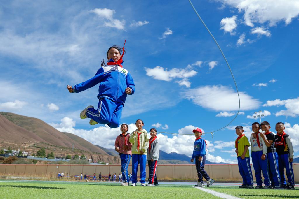 9月27日,在四川省甘孜藏族自治州,道孚县城关第一完全小学的学生在体育课上跳绳。