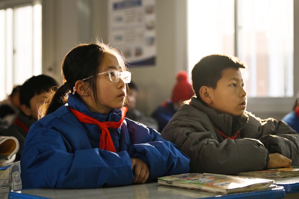 1月2日,青海省海东市民和回族土族自治县官亭镇中心学校的学生在上课。当日,受积石山6.2级地震影响停课的青海震区所有中小学校全面实现线下教学。