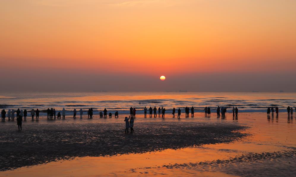 1月1日,市民在河北省秦皇岛市北戴河区浅水湾浴场海滩观看日出。