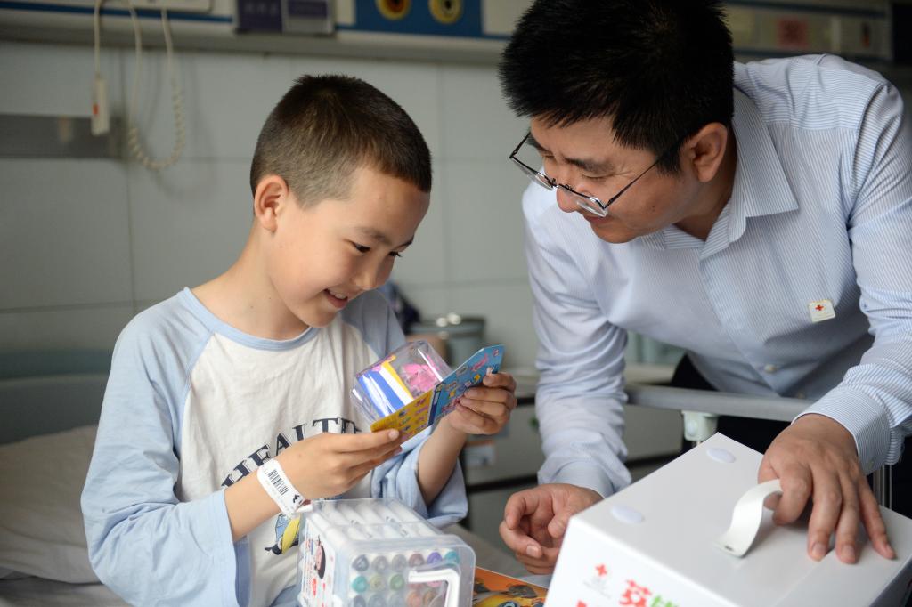 4月12日,在山东第一医科大学附属中心医院,中国红十字基金会工作人员为一名成功进行完手术的孩子送上礼物。今年3月,工作人员与医疗专家赴新疆阿勒泰、克拉玛依、塔城等地筛查先心病儿童,之后,符合手术指征的19名患儿在山东济南接受免费手术治疗。这些孩子的救治得益于中国红十字基金会“天使之旅”先心病儿童筛查救助爱心公益行动。
