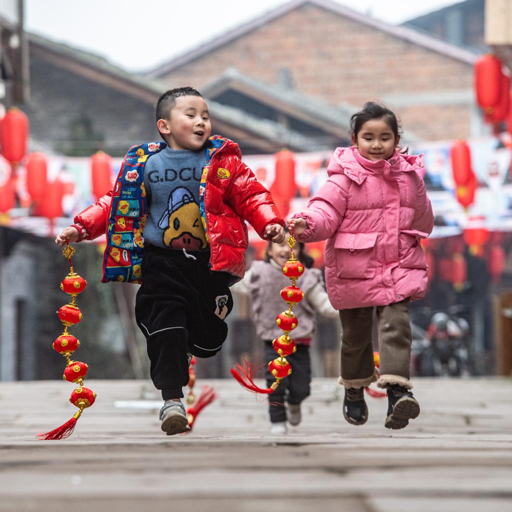 1月30日,在重庆市大足区,小朋友手拿小灯笼奔跑在雍溪古镇老街上。