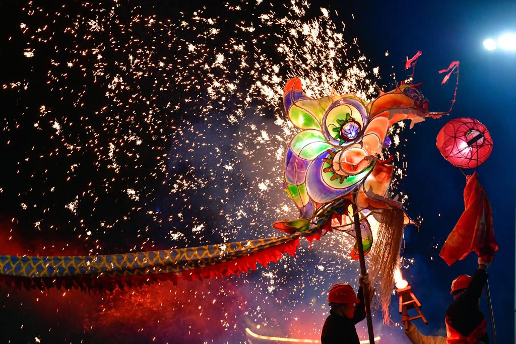2月23日晚,人们在贵州省台江县参加苗族“舞龙嘘花”活动。