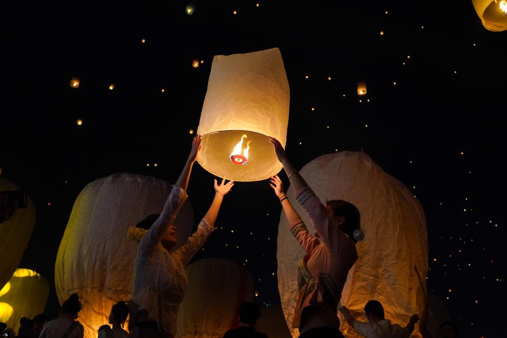 4月13日晚,人们在云南省景洪市澜沧江边放飞孔明灯,庆祝泼水节。